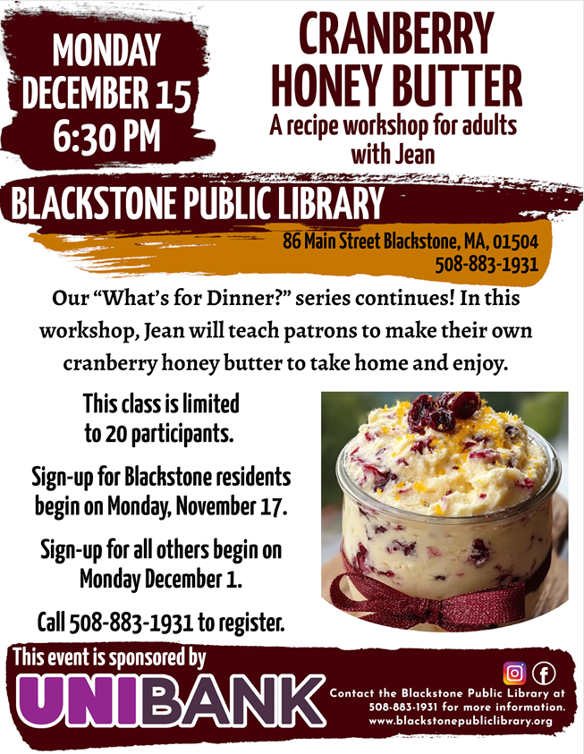 MORE INFO: This class is limited to 20 participants. Registration is required. This event is part of the “What’s for Dinner?” series, sponsored by Unibank. For more info or to sign up, contact the Blackstone Public Library at 508-883-1931.