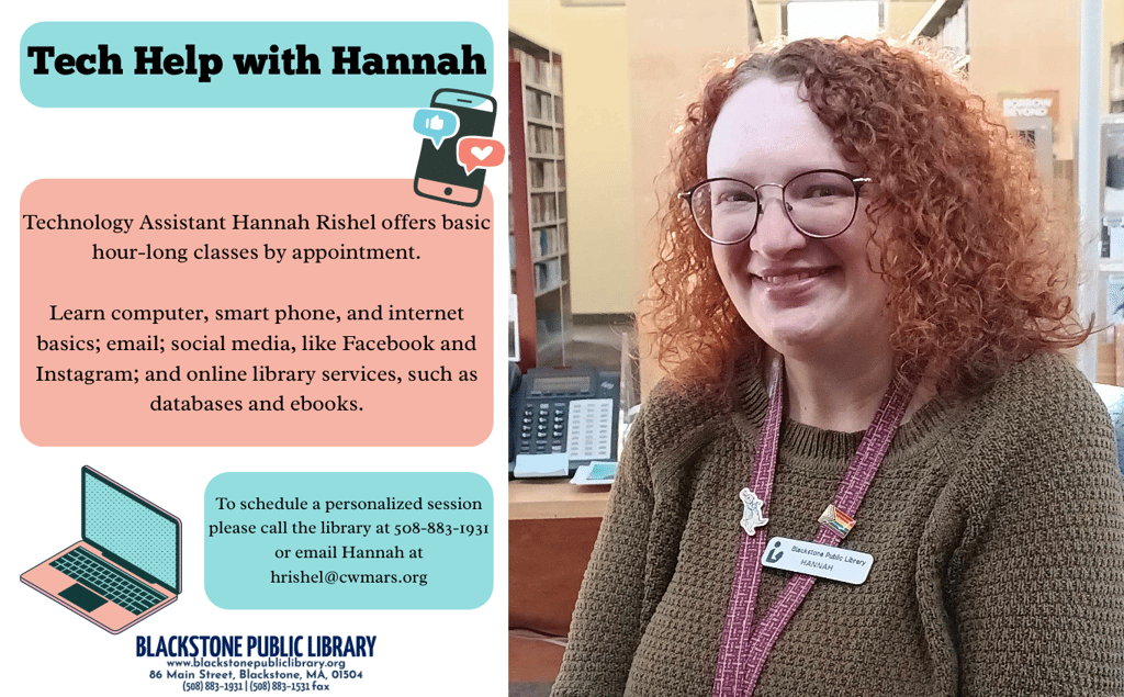 - MORE INFO: Classes are by appointment only and can be scheduled by calling the Blackstone Public Library at 508-883-1931 or by emailing Technology Assistant Hannah Rishel at hrishel@cwmars.org.
