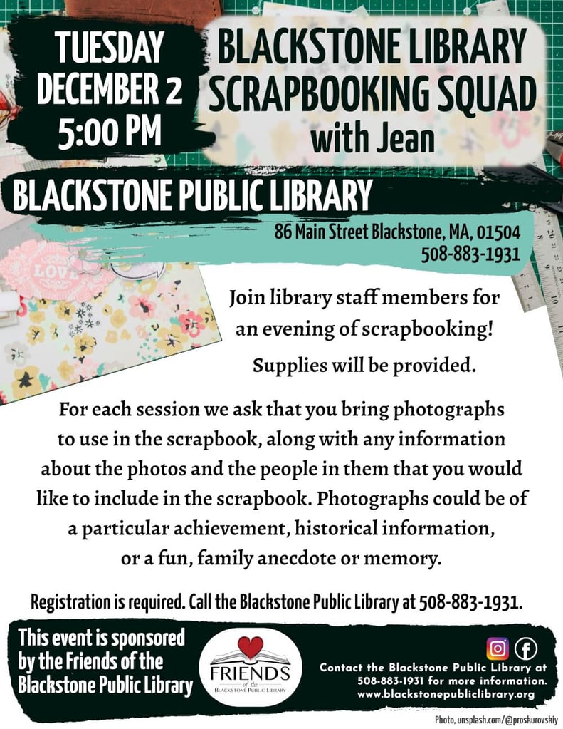 Scrap your other plans for the evening. The Blackstone Library Scrapbooking Squad is back. This family history scrapbooking class is being held on Tuesday, Dec. 2, starting at 5 p.m. at the Blackstone Public Library. The class is an opportunity to create beautiful scrapbooks, meant to preserve memories and family history. Guests at this Blackstone Public Library event are asked to bring at least four photographs each to use in the scrapbook, along with information about the subject. The rest of the supplies will be provided by library staff.