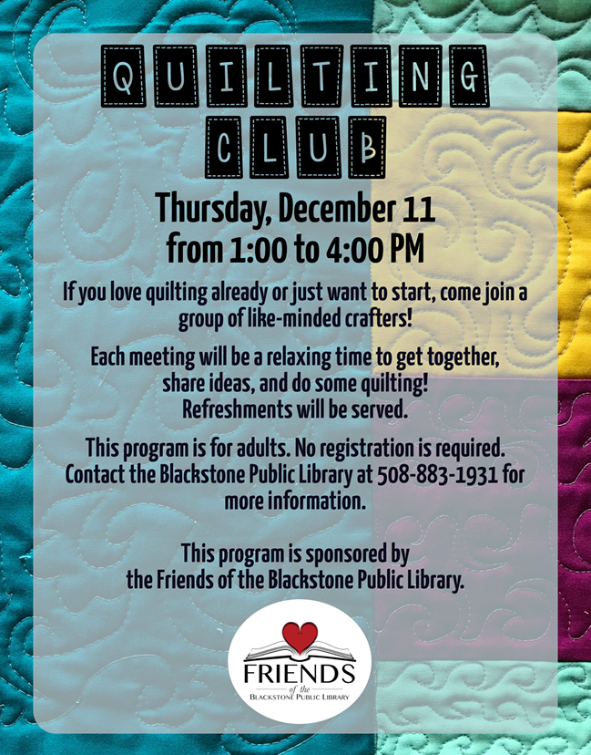 Patch it up with a group of like-minded crafters this December by joining the Quilting Club at the Blackstone Public Library. Come together for a relaxing and creative gathering with fellow quilters. Not a quilter? Become one. Learn some tips and tricks, while doing some quilting. Each meeting is an opportunity to learn, relax, share ideas, work on projects, and enjoy each other’s company.