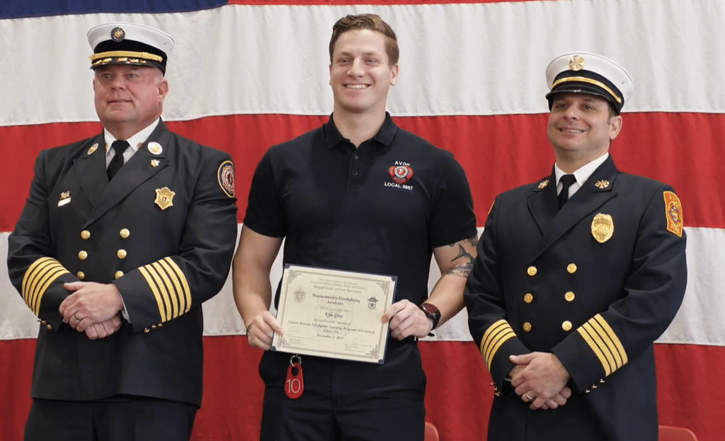 Avon Firefighter Kyle Gray, center, graduated from the Massachusetts Firefighting Academy Career Recruit Class #334 on Monday, Dec. 1. He received his certificate along with State Fire Marshal Jon M. Davine, at left, and Avon Fire Assistant Chief Brad Cronin, right. (Photo Courtesy Avon Fire Department)