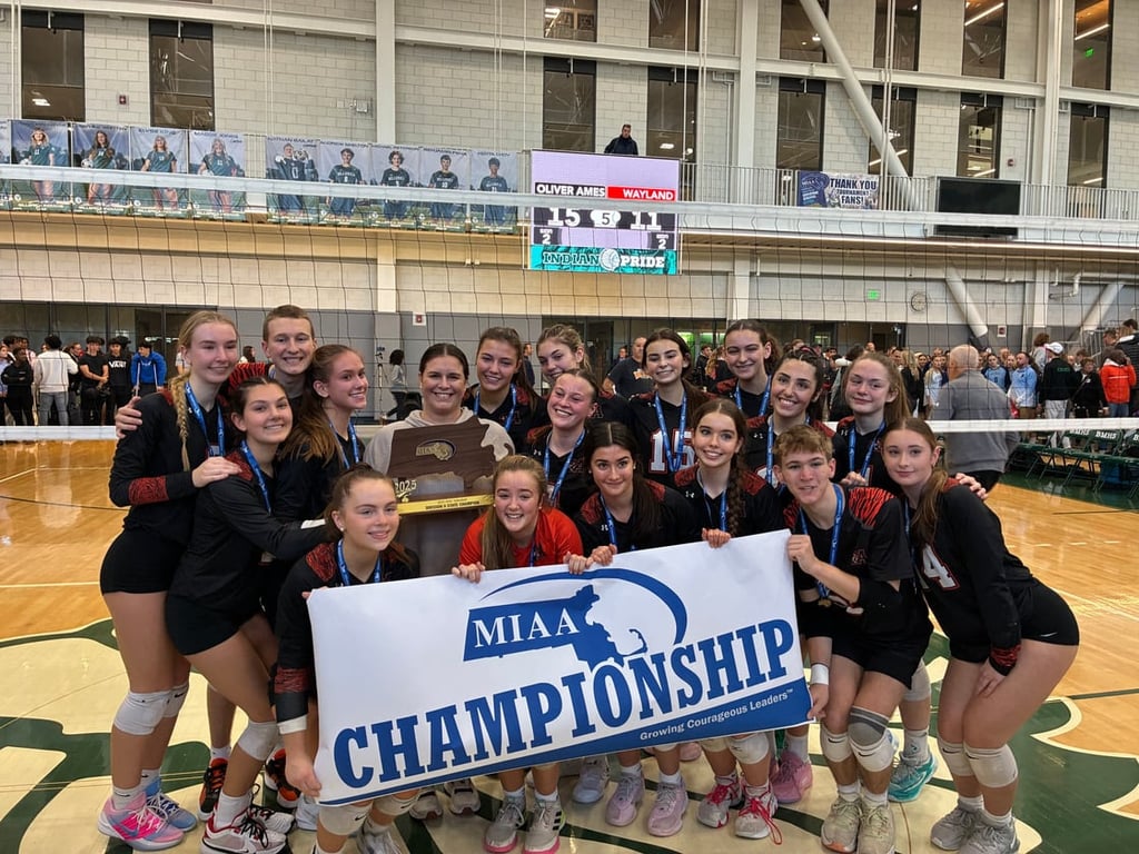 The undefeated, state champion Oliver Ames girls volleyball team after winning the MIAA Division 2 title on Nov. 15. (Photo Courtesy Easton Public Schools)