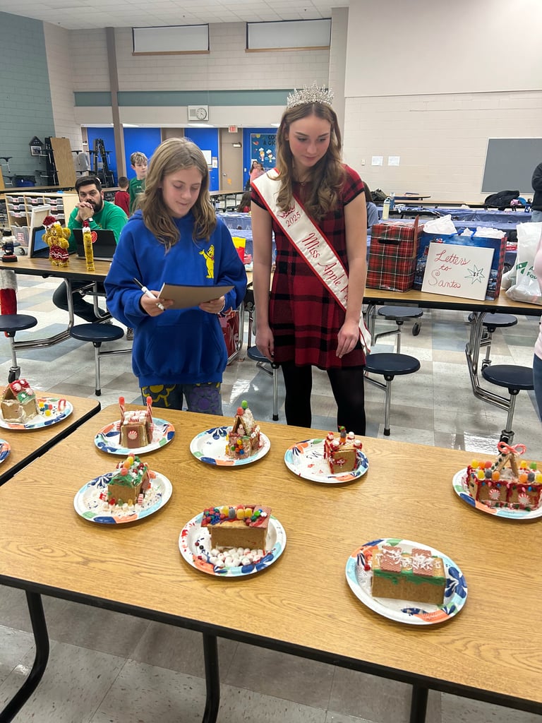 Miss Apple Peach Elyza Wagner and Charlotte Mason evaluated the Gingerbread House Contest submissions. (Photo Courtesy Acushnet Public Schools)