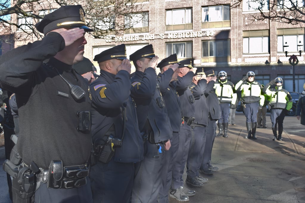Attendees included Superintendent Greg Hudon, several dozen members of the Lowell Police Department, and city leaders including Assistant City Manager Conor Baldwin and Assistant City Manager Yovani Baez-Rose.