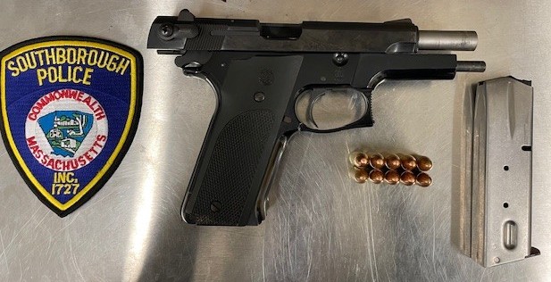 Following a traffic stop, Southborough Police located a loaded and unregistered handgun. The driver was arrested and faces gun-related charges. (Photo Courtesy Southborough Police Department)