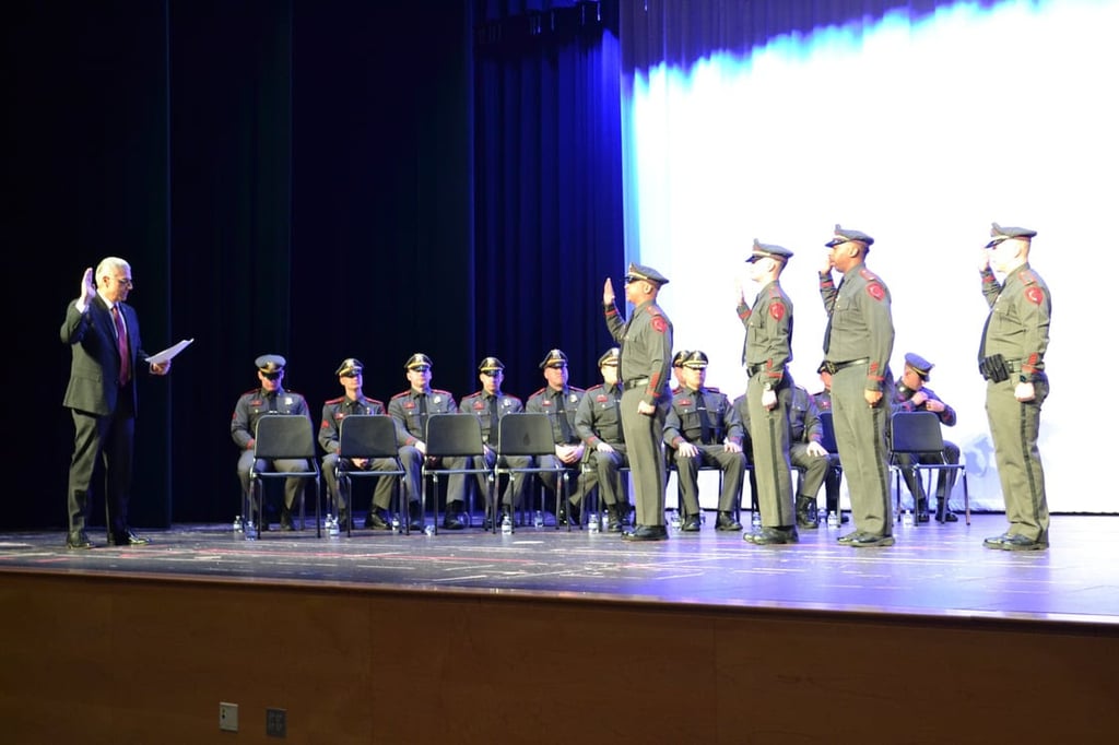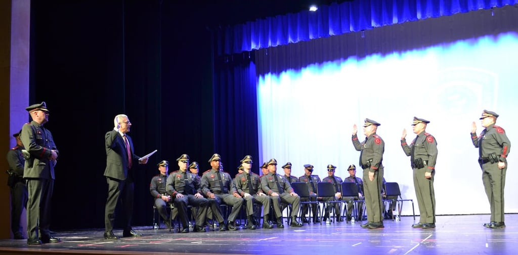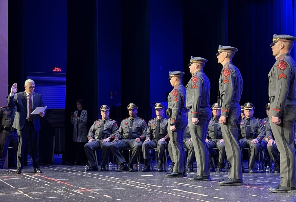 All 19 officers — a permanent Chief, a Deputy Chief, three Captains, four Lieutenants, six Sergeants and four Detectives — stood on stage Tuesday night. They each took an oath and stood at attention as loved ones pinned their badges on their uniforms.
