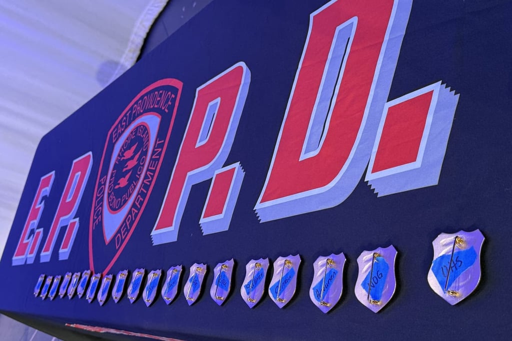 The badges assigned to all of the officers due for promotions were laid out neatly on a table on the stage prior to Tuesday evening’s Promotional Ceremony. (Photo Courtesy East Providence Police Department)