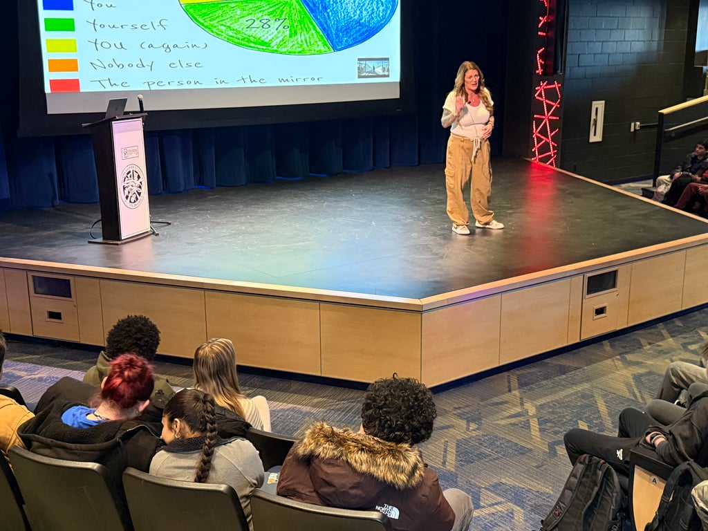 Following the presentation, several students approached Anderson and expressed appreciation for her authentic approach to mental health, including one student who gave her a big hug. (Photo Courtesy Southeastern Regional School District)