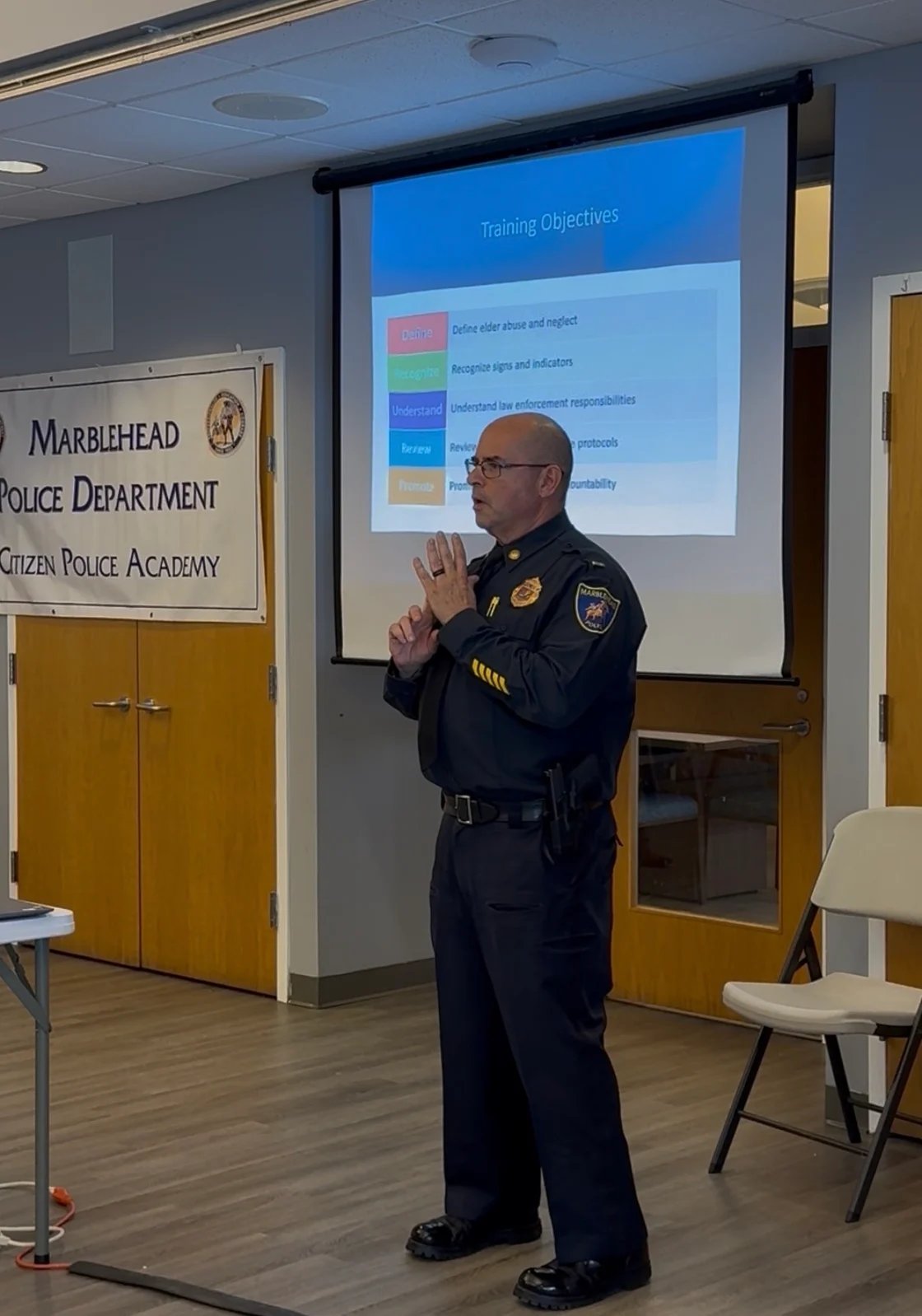 Lt. David Ostrovitz speaks to participants about elder abuse and neglect at the inaugural Citizens Academy 2.0. (Photo Courtesy Marblehead Police Department)