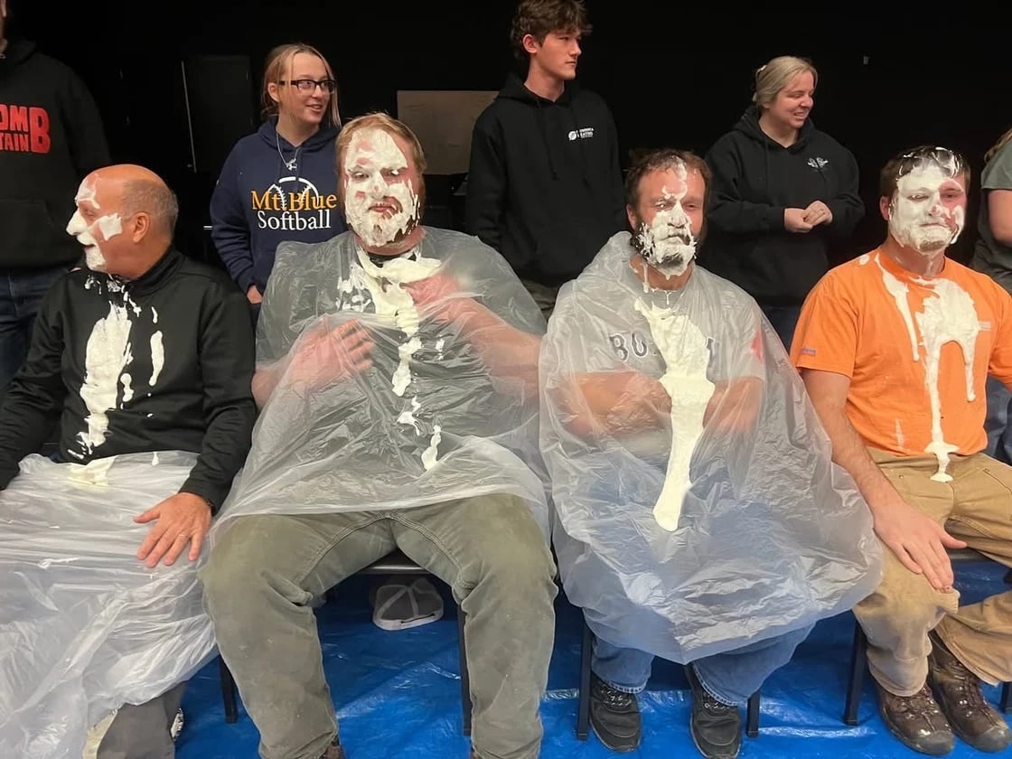 Each time students at Foster Career and Technical Education Center donated a food item, they received a raffle ticket to vote on a member of the staff to get a pie to the face during the next assembly. (Photo Courtesy Mt. Blue Regional School District)