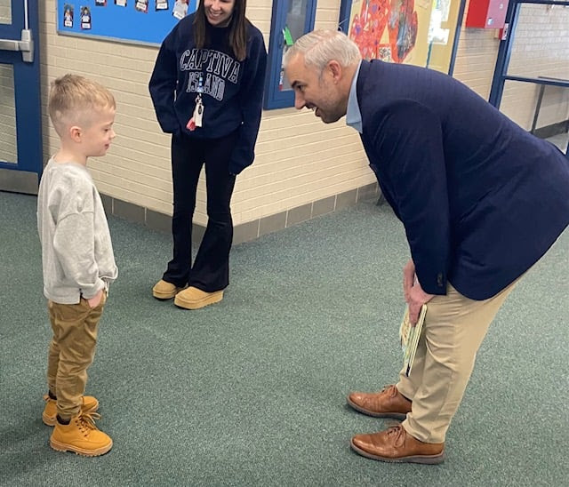 Franklin Public Schools Superintendent Lucas Giguere greets a student while celebrating Read Across America Week. (Photo Courtesy Franklin Public Schools)