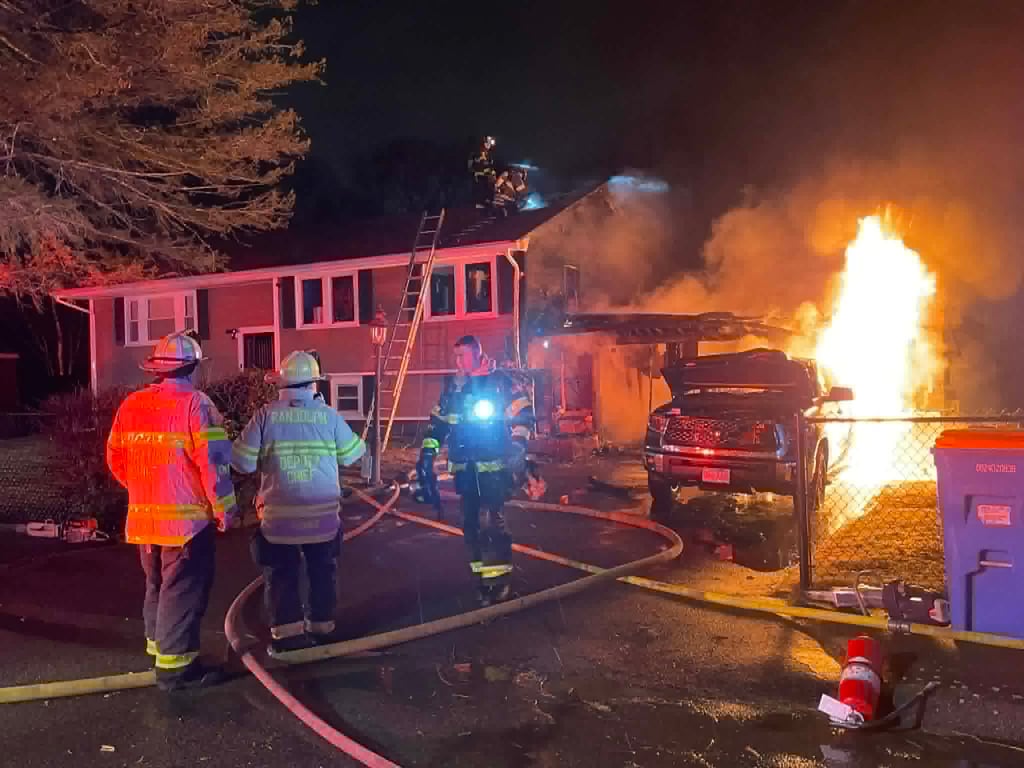 Randolph firefighters battled a fire in an attached garage that spread to the home and a vehicle on Friday night. (Photo Courtesy Dave Stewart/MassFirePics)
