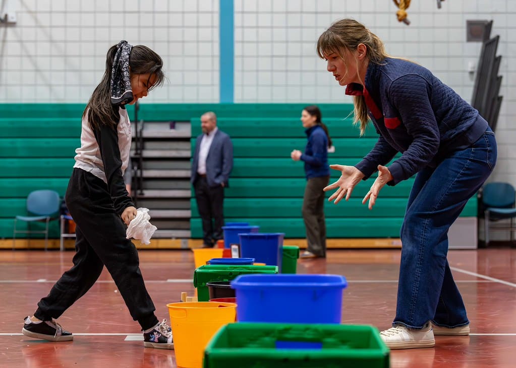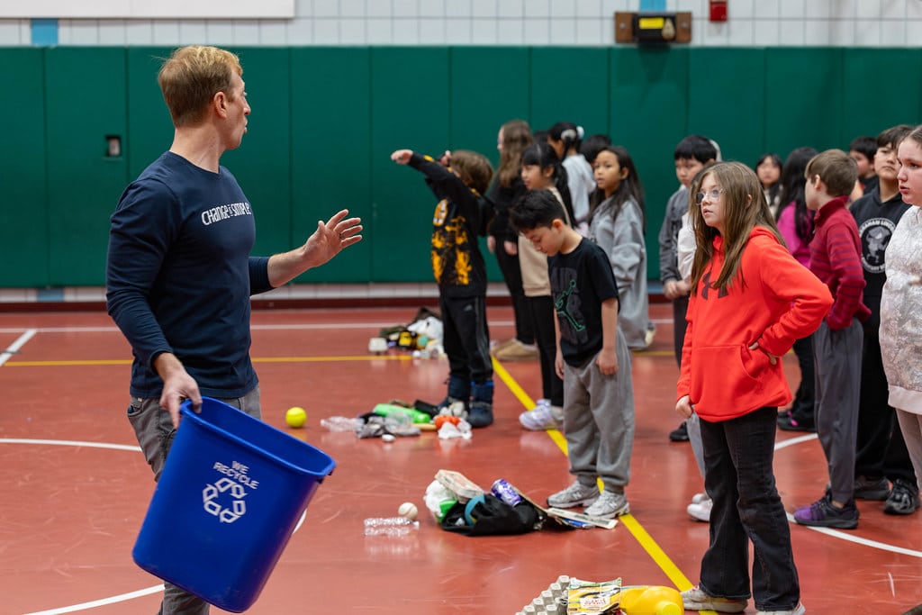 Students took part in relay races as they learned to separate waste into recyclables, compost, textiles, trash, and items that can be reduced or reused. By the end of an hour’s worth of relay races, students were placing practically no items in the trash bin.