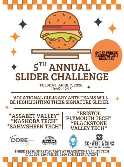 The event is open to the public for $9 per person and reservations are required. Reservations can be made by calling Three Seasons Restaurant at Blackstone Valley Tech at 508-529-7758 ext. 3109.