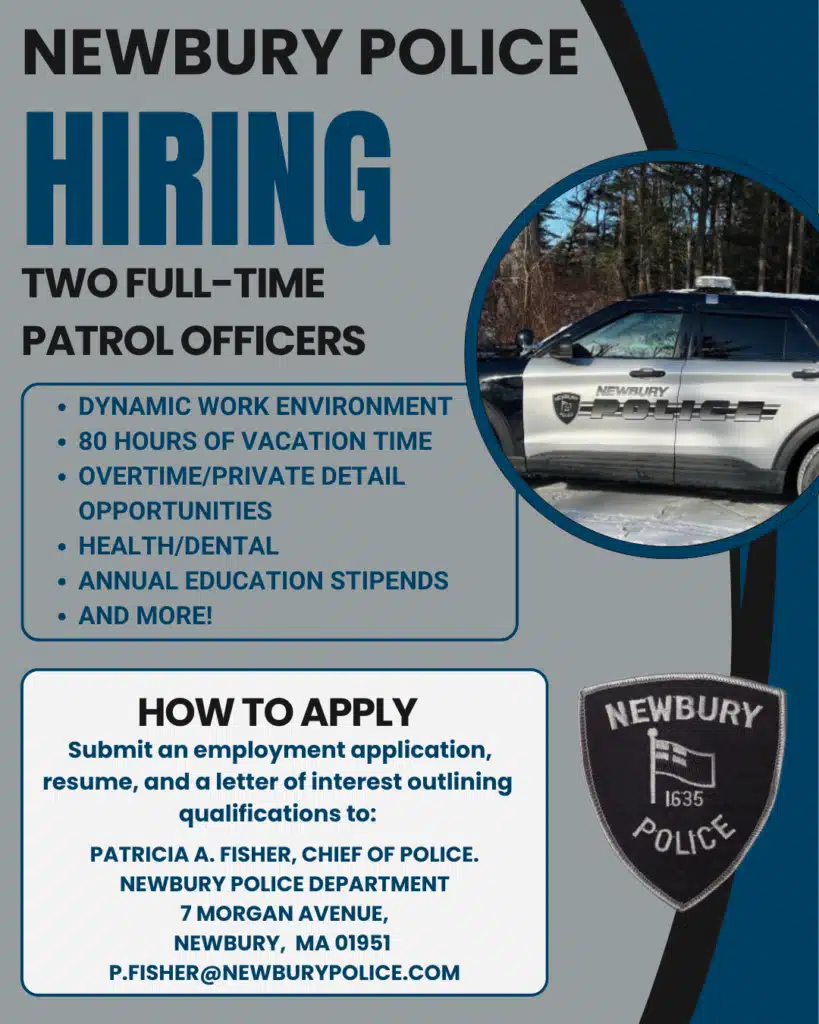 NEWBURY — Police Chief Patricia Fisher is pleased to share that the Newbury Police Department is hiring two full-time patrol officers.
