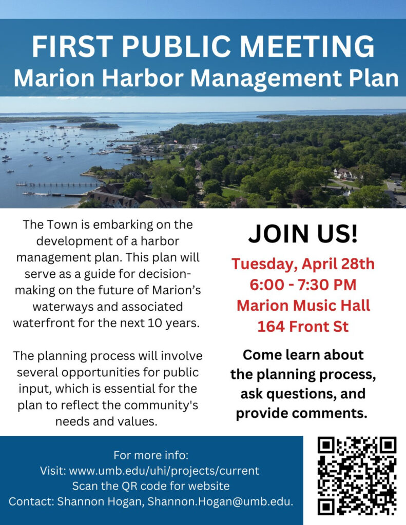 The Town of Marion, with support from the Urban Harbors Institute (UHI) at UMass Boston and the Marine Resources Commission (MRC), has begun developing a Harbor Management Plan that will guide decision-making for Marion’s waterways and waterfront over the next decade. The plan is intended to address the future use, protection and management of the Town’s harbor and related coastal resources.