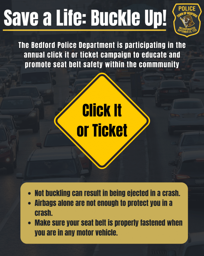 BEDFORD — Police Chief Ken Fong shares that the Bedford Police Department will participate in the National Highway Traffic Safety Administration’s (NHTSA) nationwide “Click It or Ticket” campaign throughout May.
