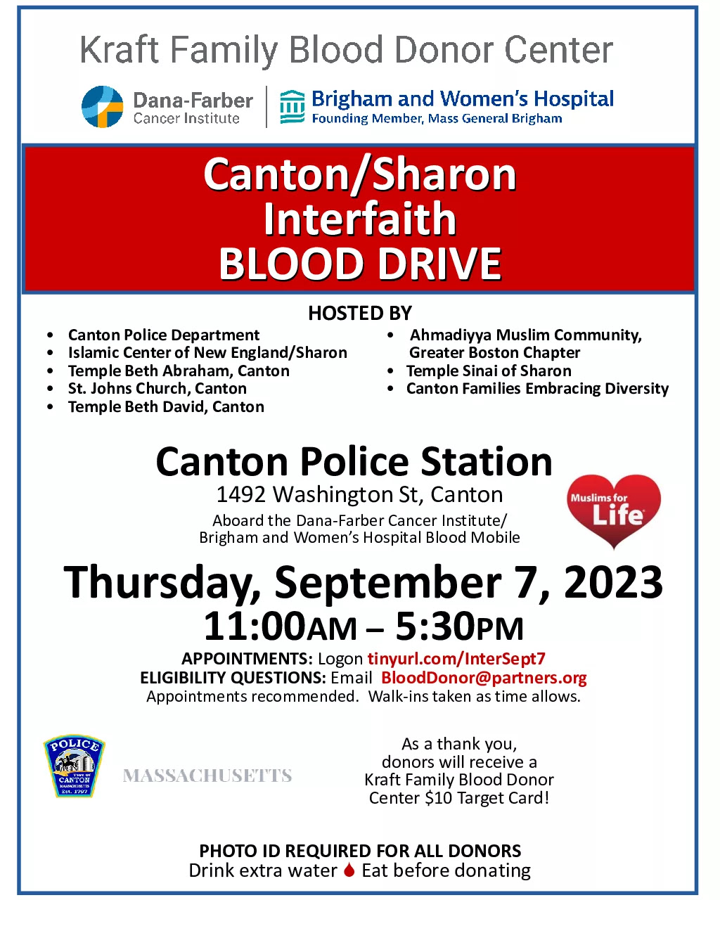 The Town of Canton is pleased to share that a Canton/Sharon Interfaith Blood Drive will…