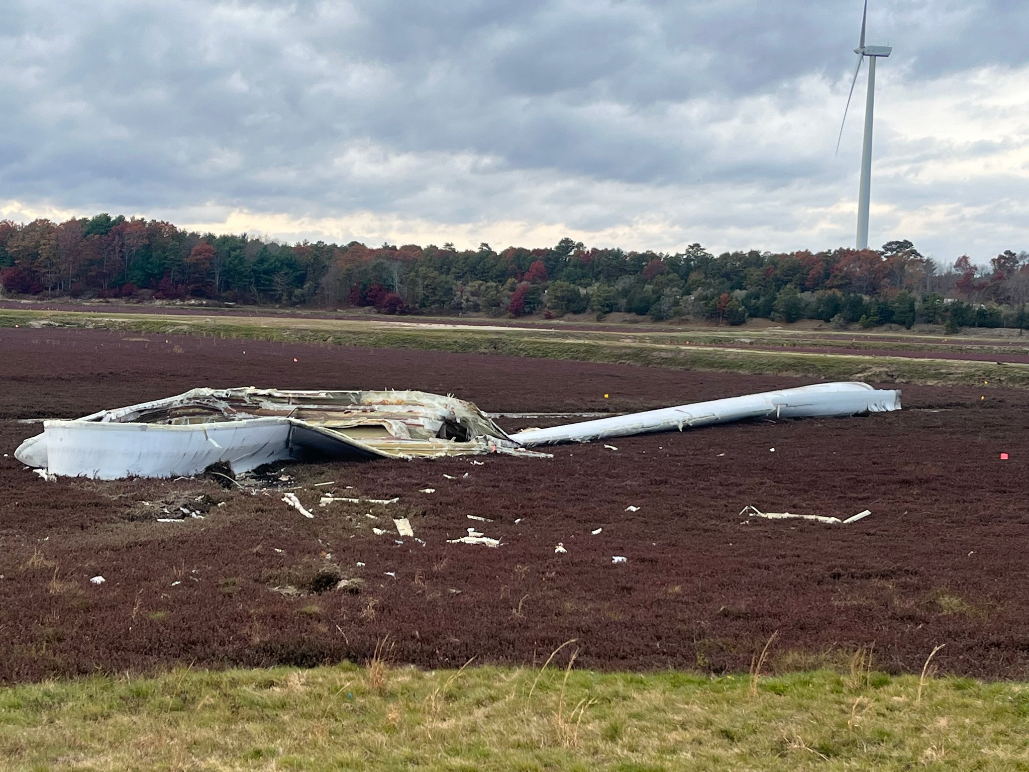 The blade from a wind turbine fell off and landed in a cranberry bog off…