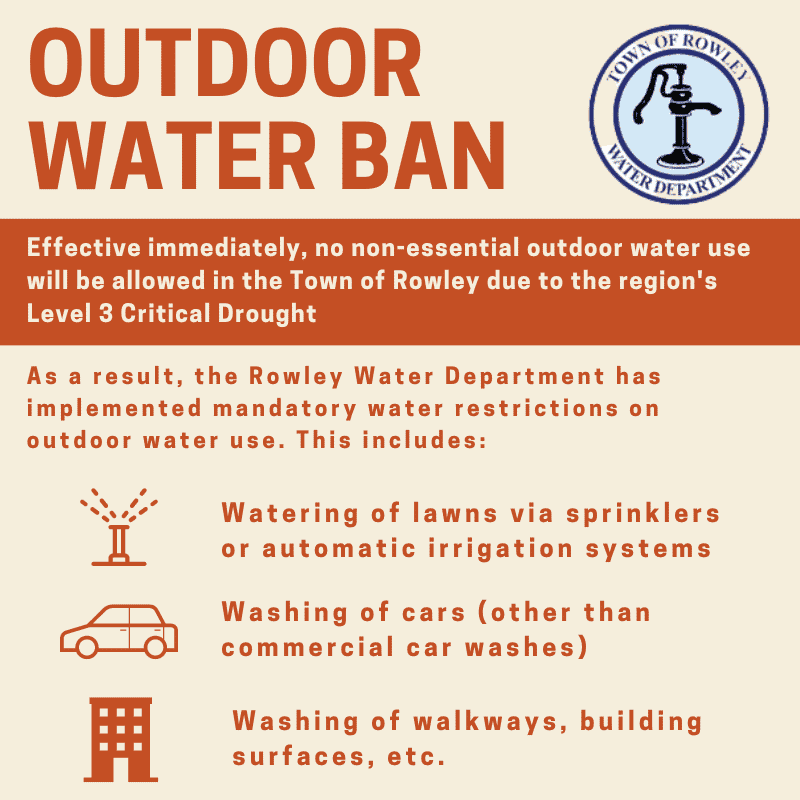 ROWLEY — The Rowley Water Department announces that mandatory water use restrictions are now in effect.…