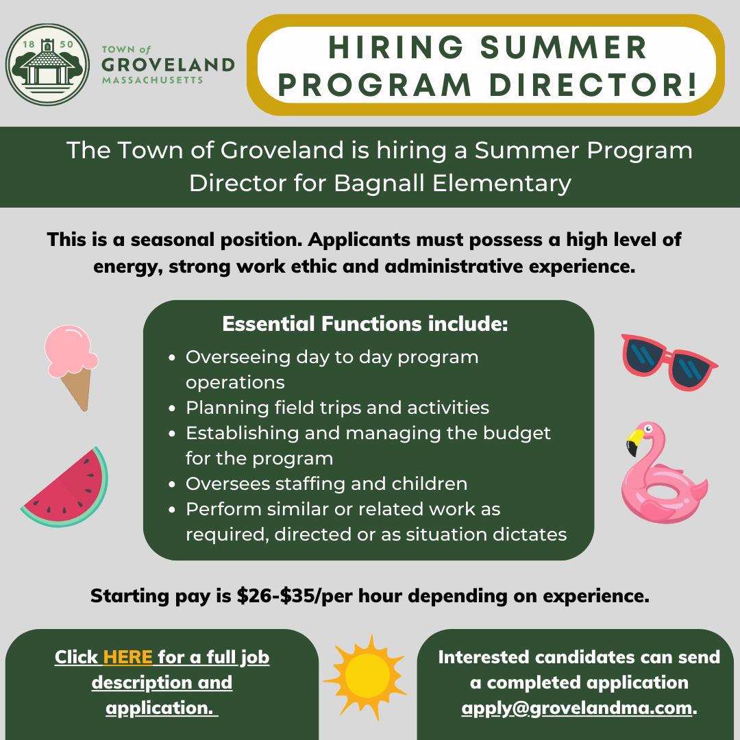 GROVELAND – Town Administrator Rebecca Oldham would like to share that the Town of Groveland…