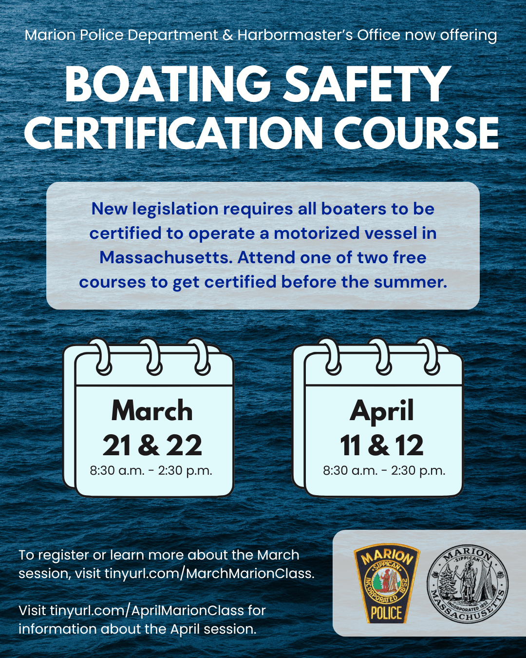 MARION — The Marion Police Department and Harbormaster’s Office are offering two free sessions of…