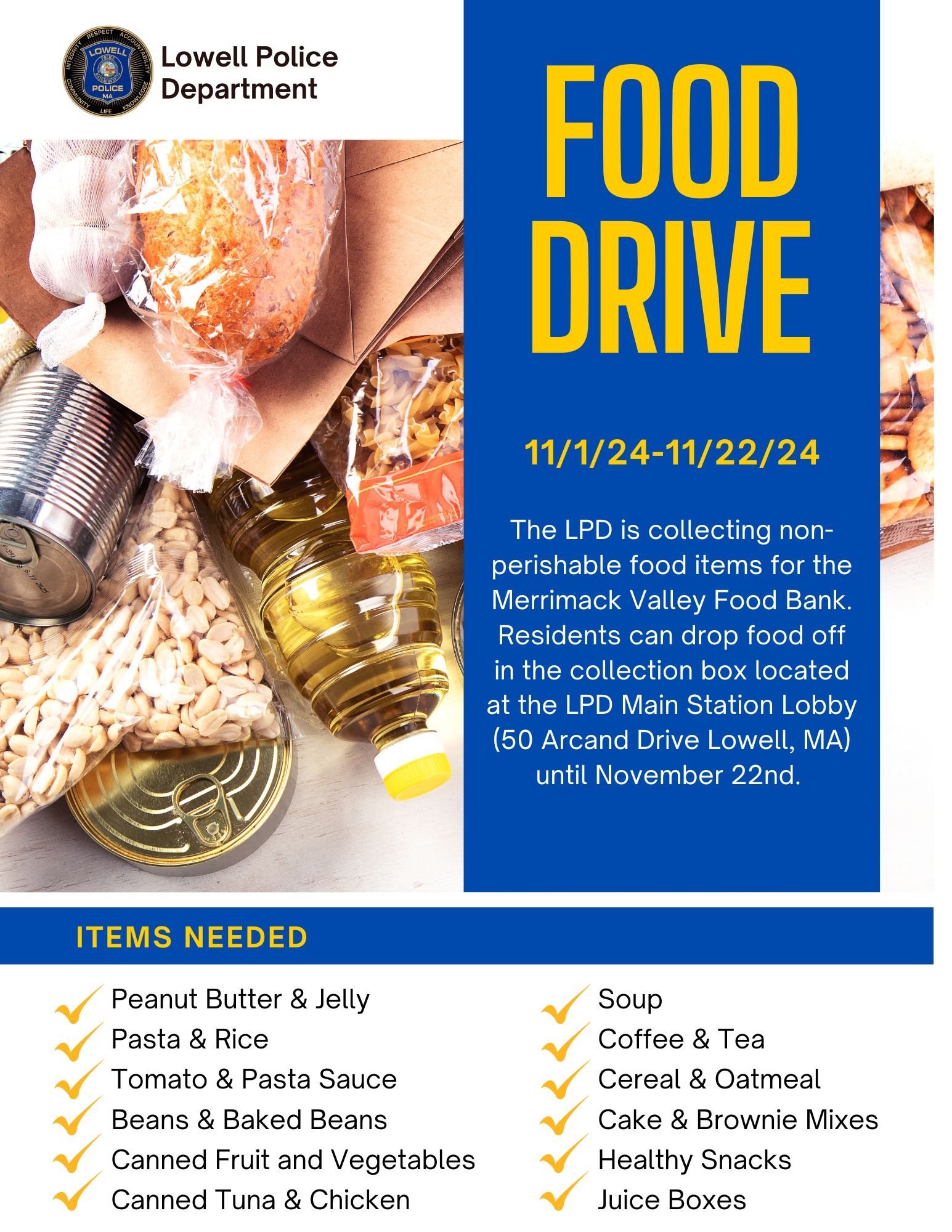 LOWELL — Superintendent Greg Hudon reports that the Lowell Police Department will be collecting non-perishable…