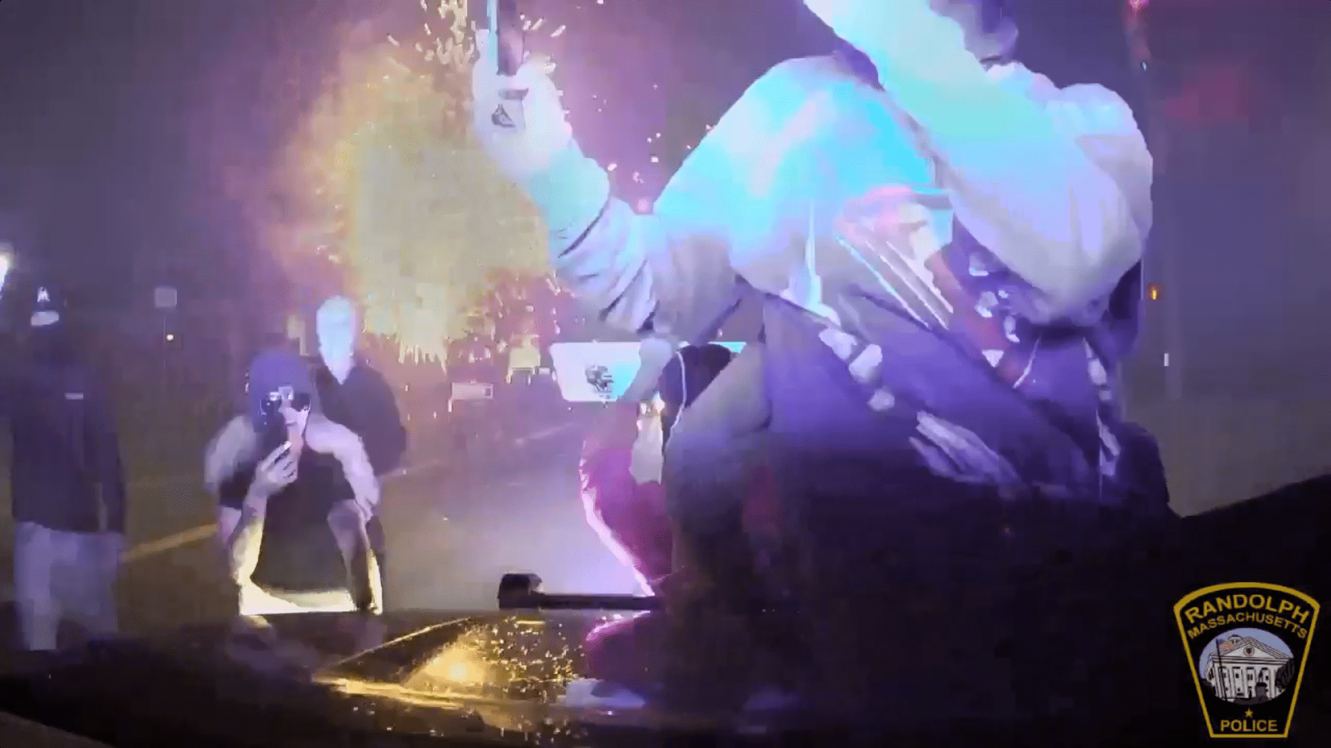 The first-arriving Randolph Police officer witnessed about 100 people in the street, with some setting…