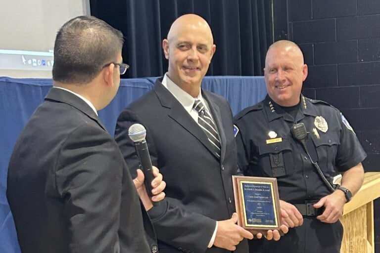 Superintendent Justin Bartholomew, Principal Brenda Erhardt and Fine & Performing Arts Department Chair David Schumacher…