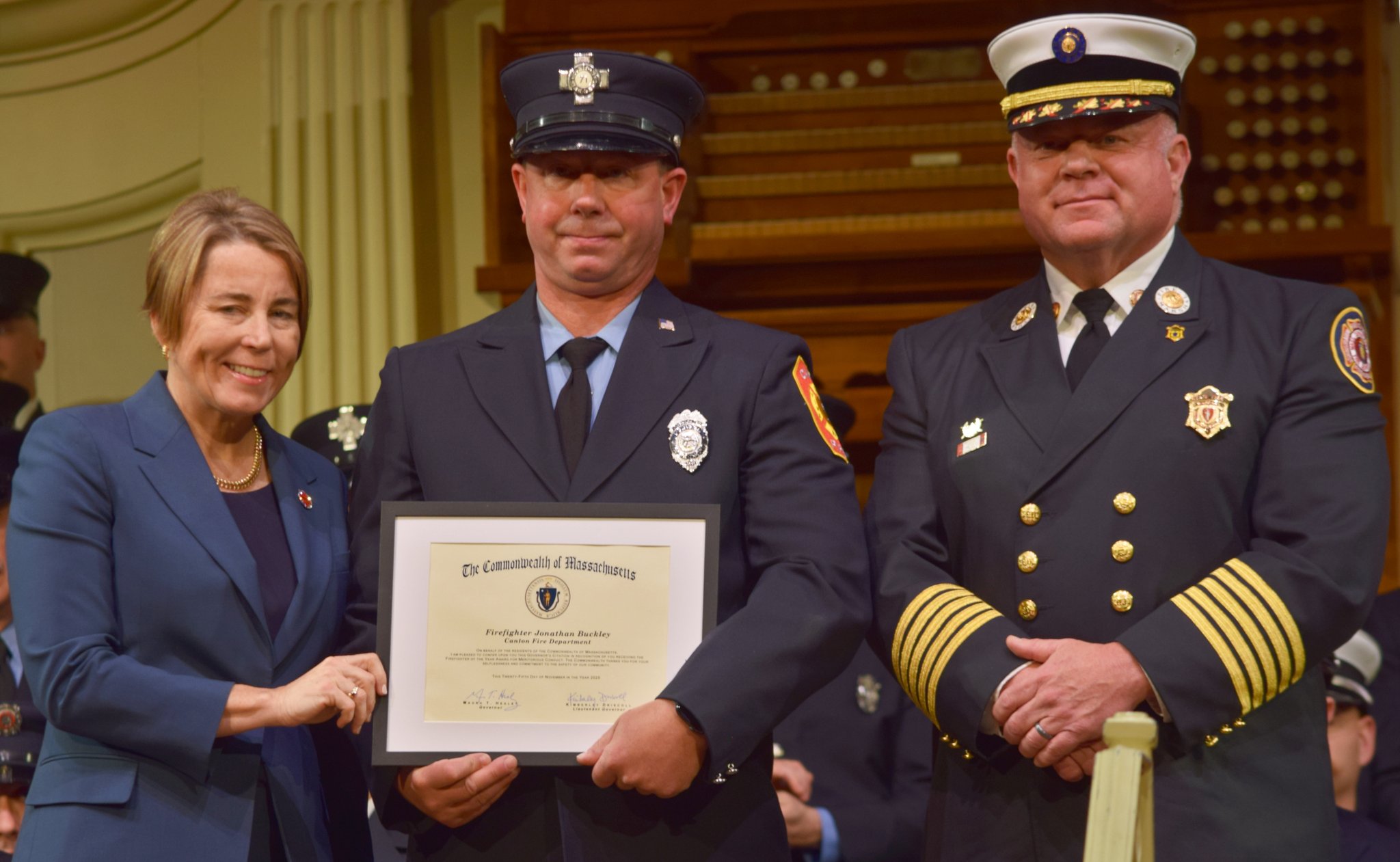 Canton Firefighter Jonathan Buckley, center, receives a 2025 Governor’s Citation for Meritorious Conduct at 36th…