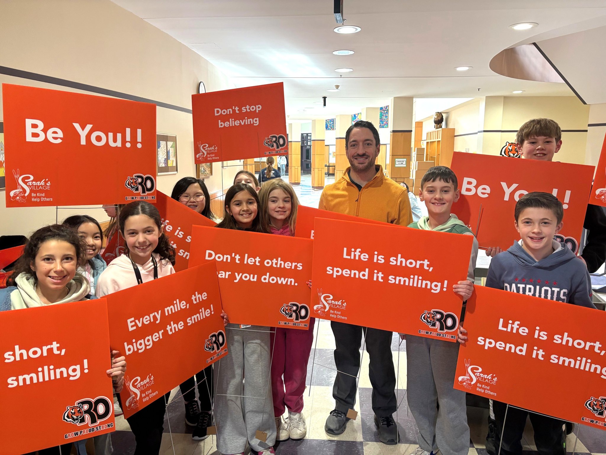 Richardson Olmsted School Health Teacher Devin Beck, center, poses with fifth-grade students holding positive message…
